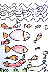 Dessins réalisés sur papier, marqueur noir et crayon de couleurs, par des enfants de 5 ans, école maternelle de Vouillé (86190).