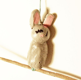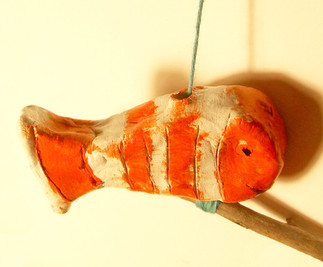 Sculptures en argile blanche autodurcissante, peintes à l'acrylique, montage sur des branches et ficelle, par des enfants de 9-11 ans, école élémentaire de Vouillé (86190).