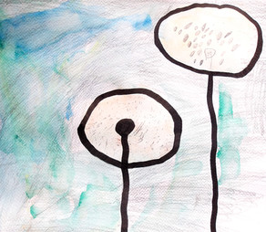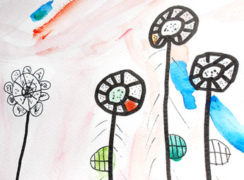 Peintures réalisées sur du papier épais, aquarelle et marqueur noir, par des enfants de 5 ans, école maternelle de Vouillé (86190).