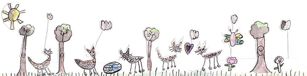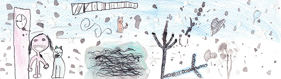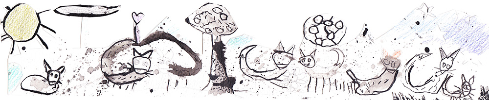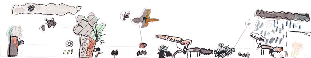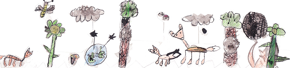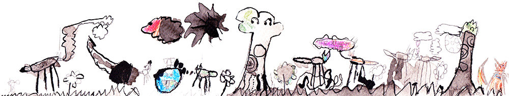 Sculptures, crayon de couleurs, encre de Chine à la plume et au lavis sur papier épais, par des enfants de 6-11 ans, projet proposé dans différentes écoles élémentaires.